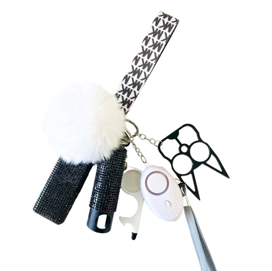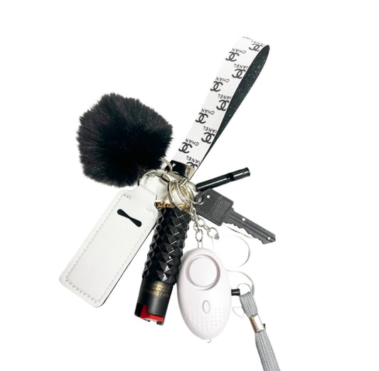 This keychain comes with: (1) Wristlet (1)Fur ball (1) Studded Pepper spay (1)Personal Alarm (1)...