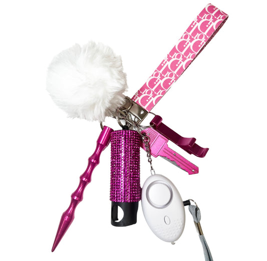 This keychain comes with: (1) Wristlet (1)Fur ball (1)Bling Pepper spay (1)Personal Alarm (1) Kubotan ...