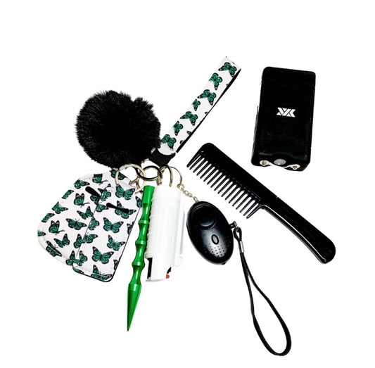 This keychain comes with: (1) Wristlet (1)Fur ball (1) Kubotan (1) Pepper spay (1)Alarm (1)...
