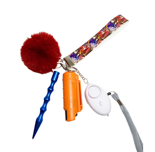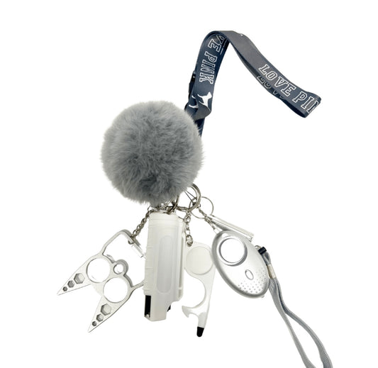 This Safety Keychain Comes With (1) Wristlet (1)Fur Ball (1) kubotan (1) Pepper spray ...