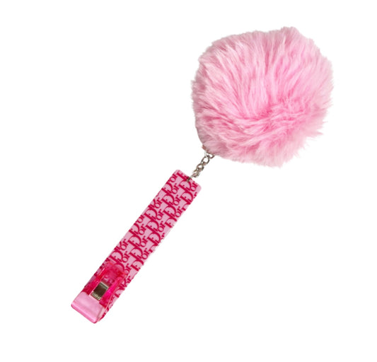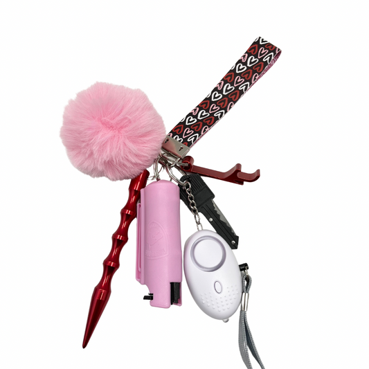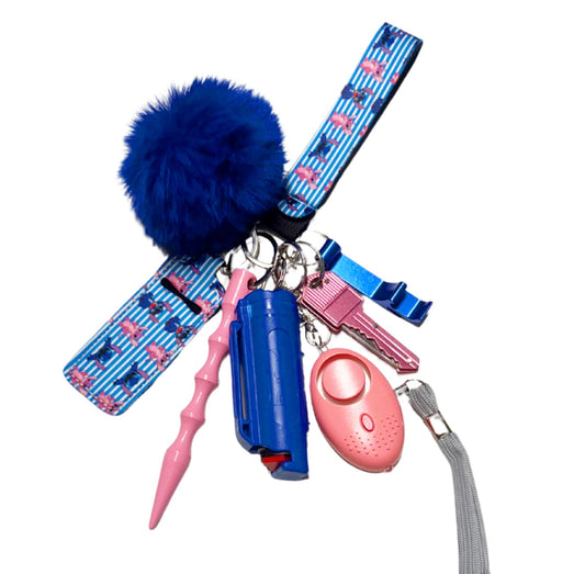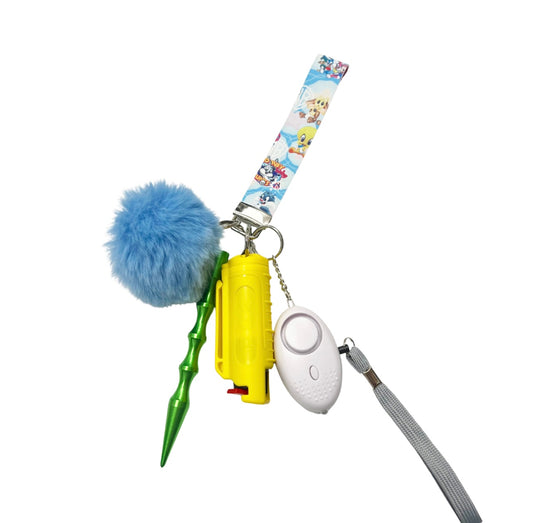This keychain comes with: (1) Wristlet (1)Fur ball (1)Bling Pepper spay (1)Personal Alarm (1) Kubotan ...