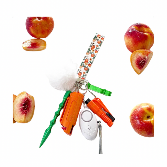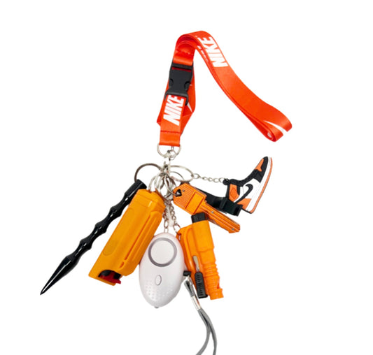 This keychain comes with: (1)Lanyard (1)Fur ball (1)Pepper spay (1)Alarm (1)Kubotan (1)3-1 safety whistle, window...