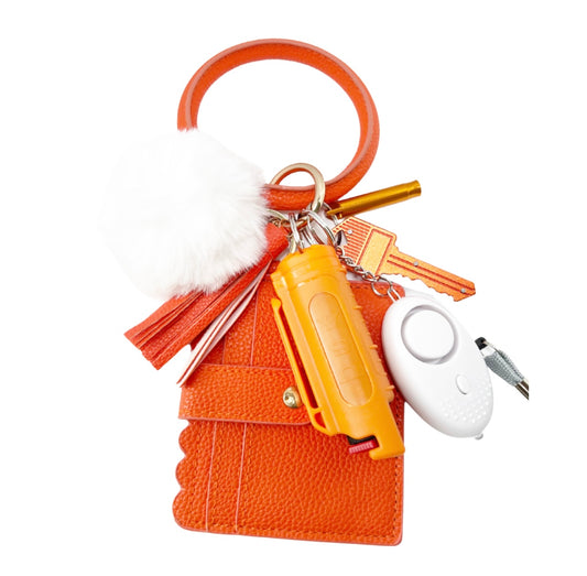 This keychain comes with: (1) Wristlet (1)Fur ball (1)Bling Pepper spay (1)Personal Alarm (1) Kubotan ...