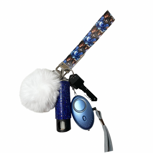 This keychain comes with: (1) Wristlet (1) Fur Ball (1) Kubaton (1) Bling Pepper Spray...
