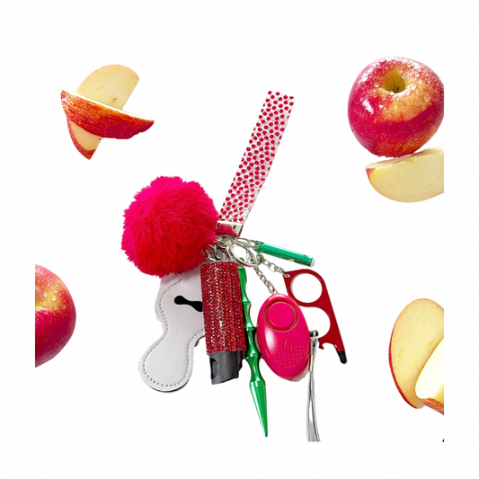 This keychain comes with: (1) Wristlet (1)Fur ball (1) Bling Pepper spay (1)Personal Alarm (1)...