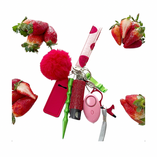 This keychain comes with: (1) Wristlet (1)Fur ball (1)Bling Pepper spay (1)Personal Alarm (1) Kubotan ...
