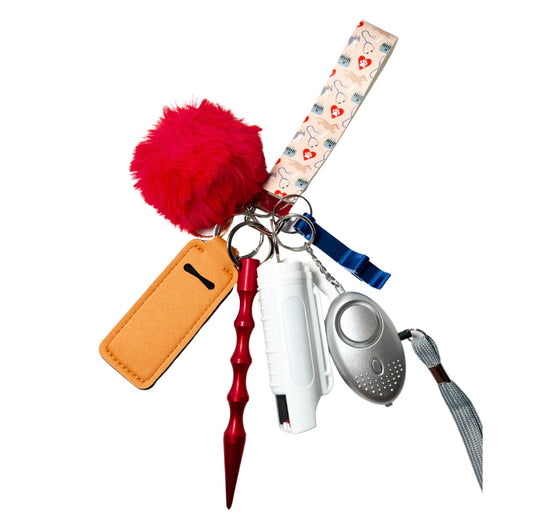 This keychain comes with: (1) Wristlet (1)Fur ball (1) Pepper spay (1)Alarm (1) Pair Of...