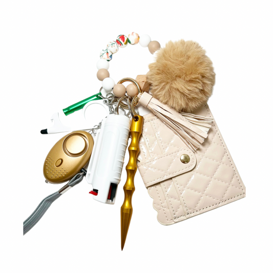 This Keychain Comes With: (1) Wristlet (1)Fur Ball (1) Kubotan (1)Pepper Spray (1) Personal Alarm ...