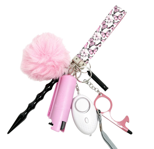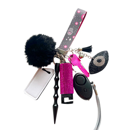 This keychain comes with: (1) Wristlet (1)Fur ball (1)Bling Pepper spay (1)Personal Alarm (1) Kubotan ...